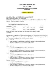 - Name announced at the beginning of each show, thanked in our program and your advertisement displayed near the entrance to the theatre.